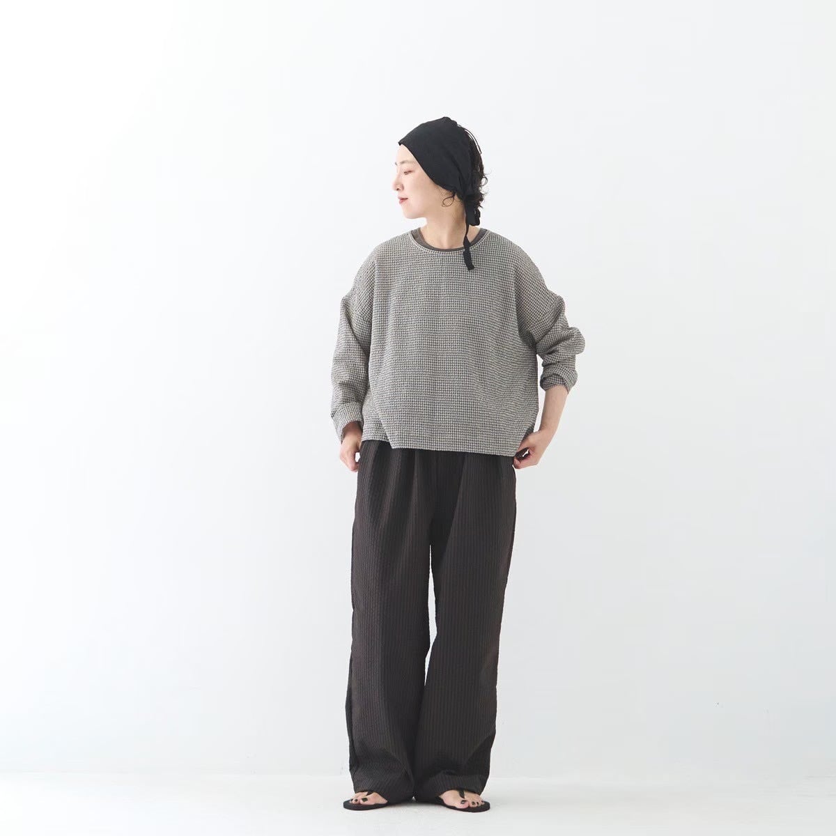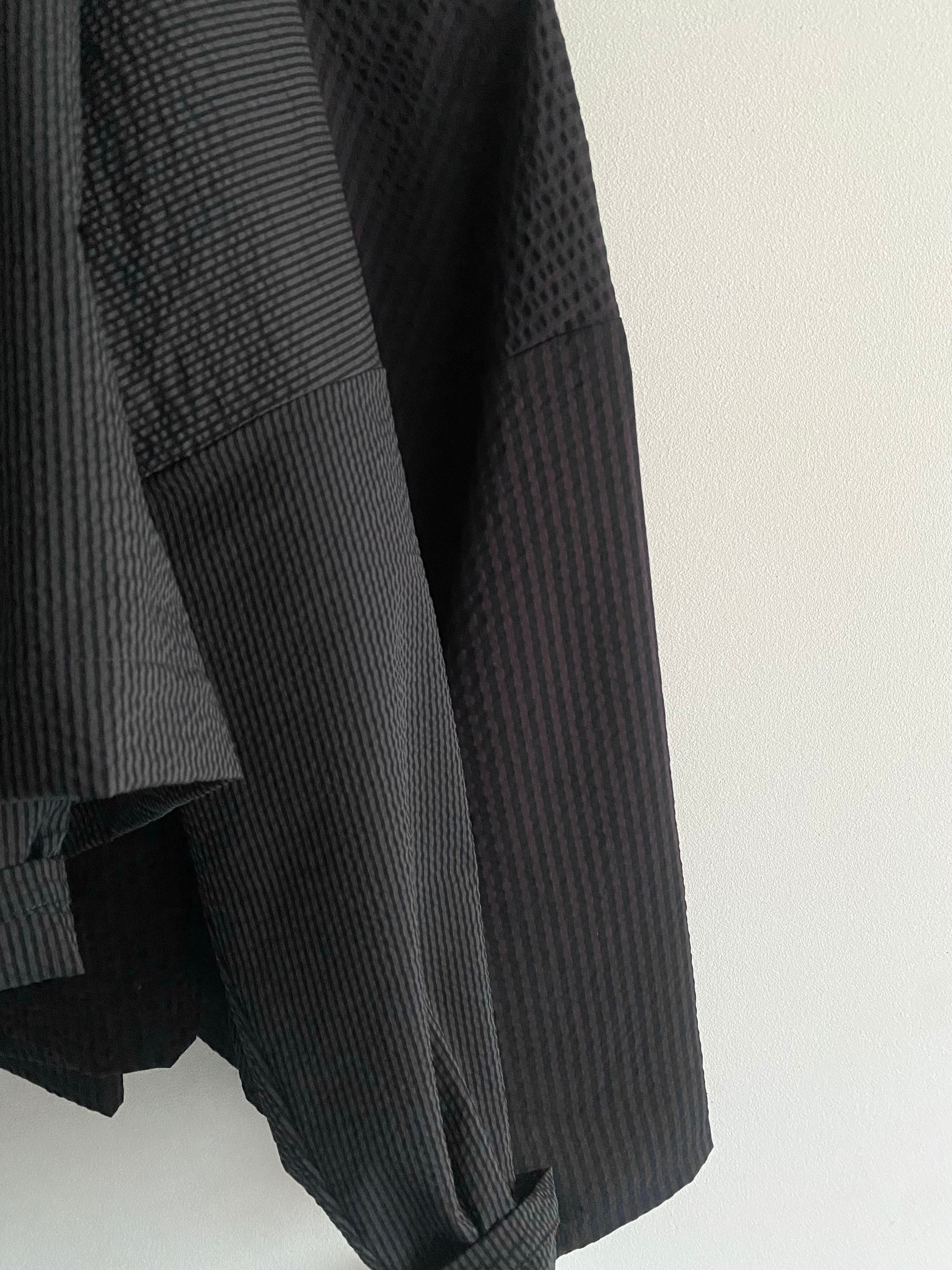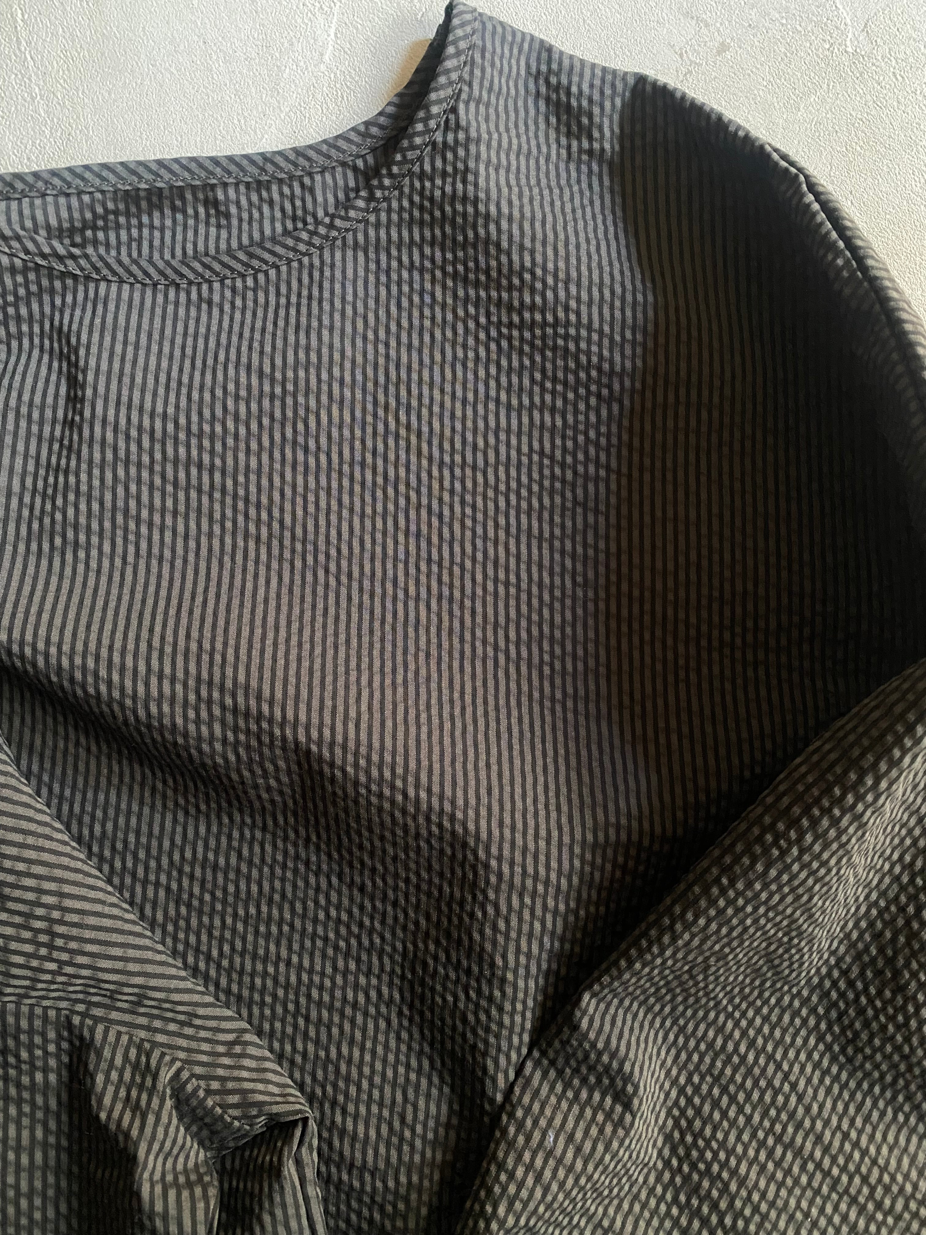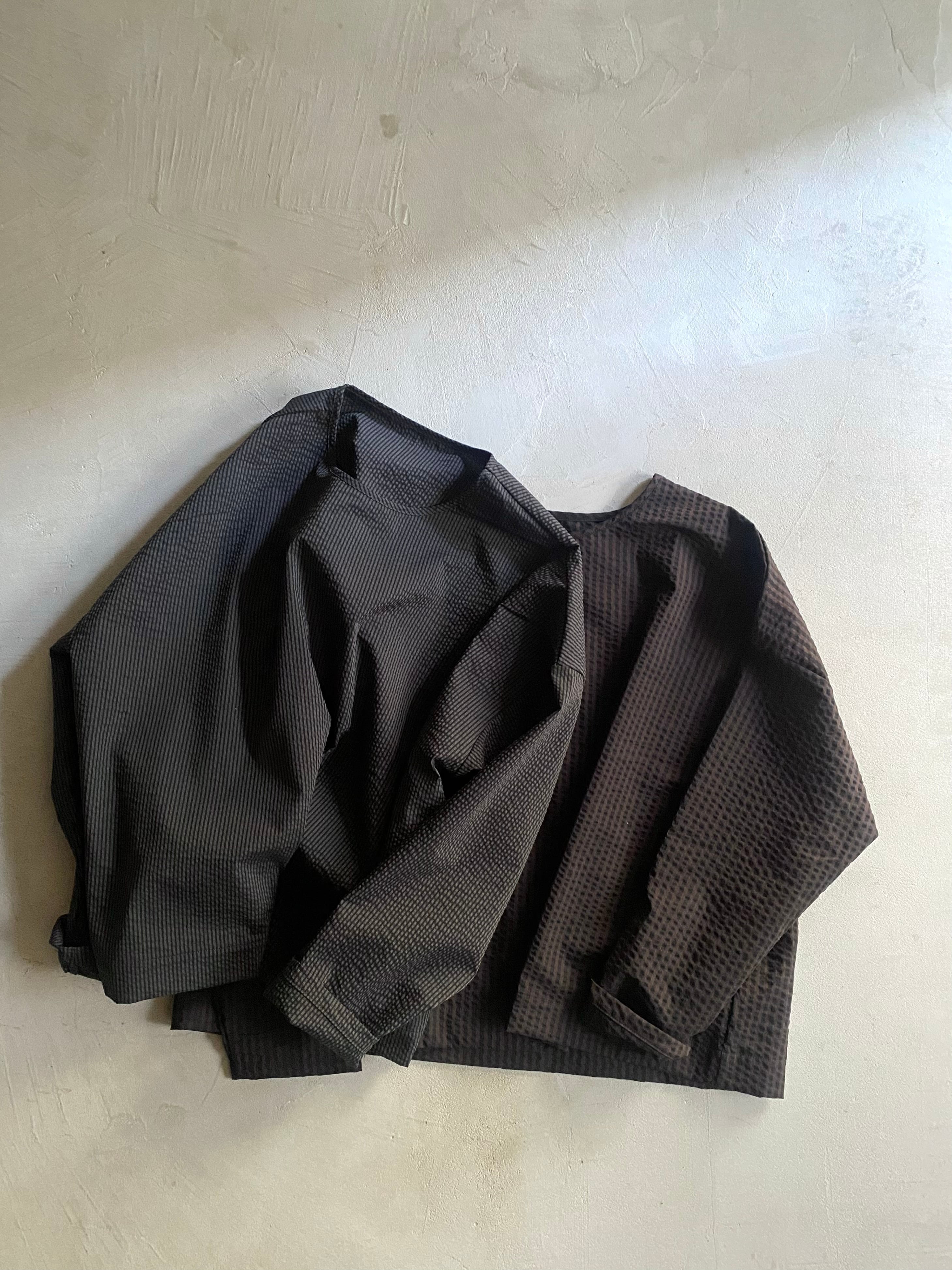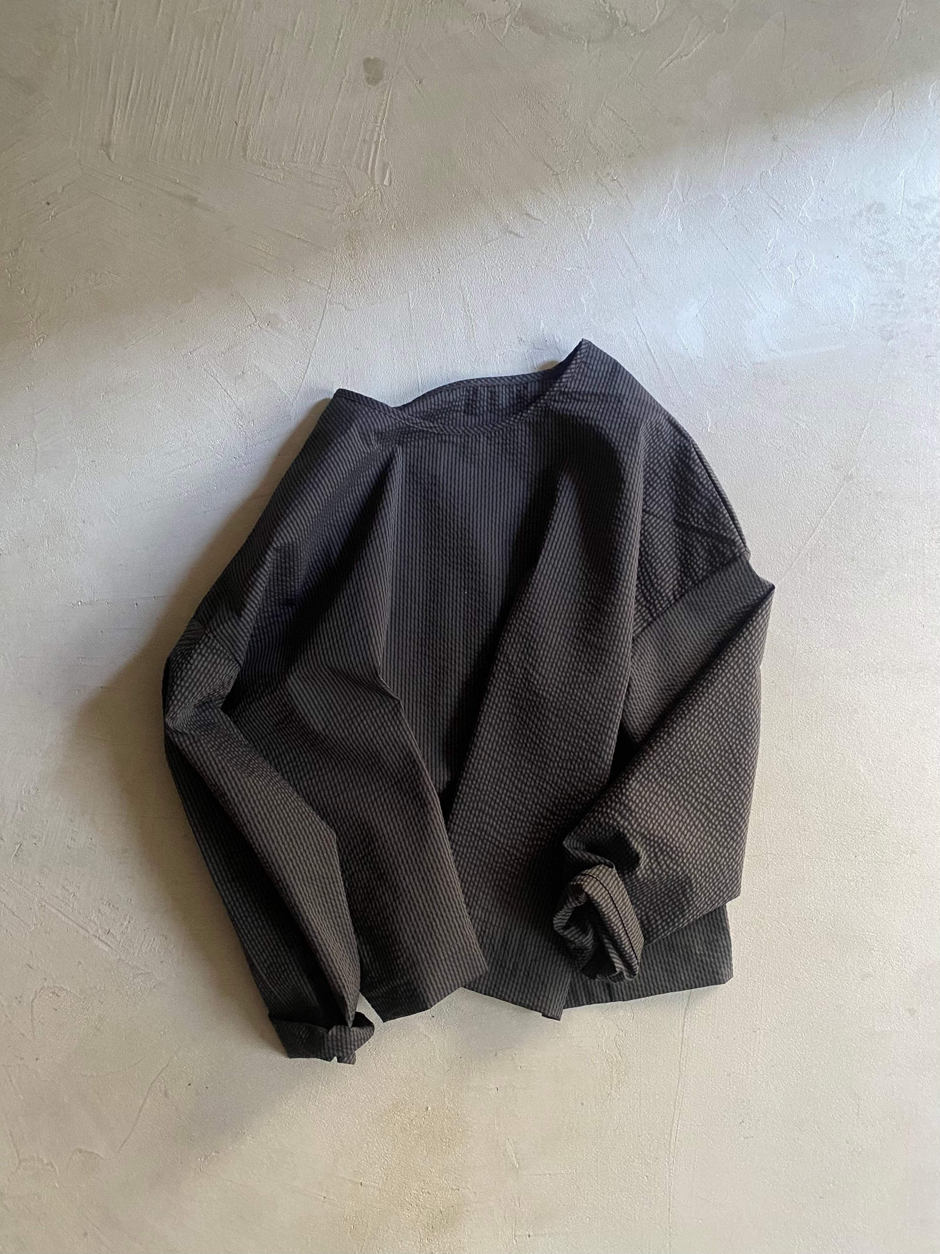 凸凹した縞状のシボが特徴のサッカー生地で仕上げました。ぽこぽことしたふくらみが空気を含み、柔らかく肌に添います。