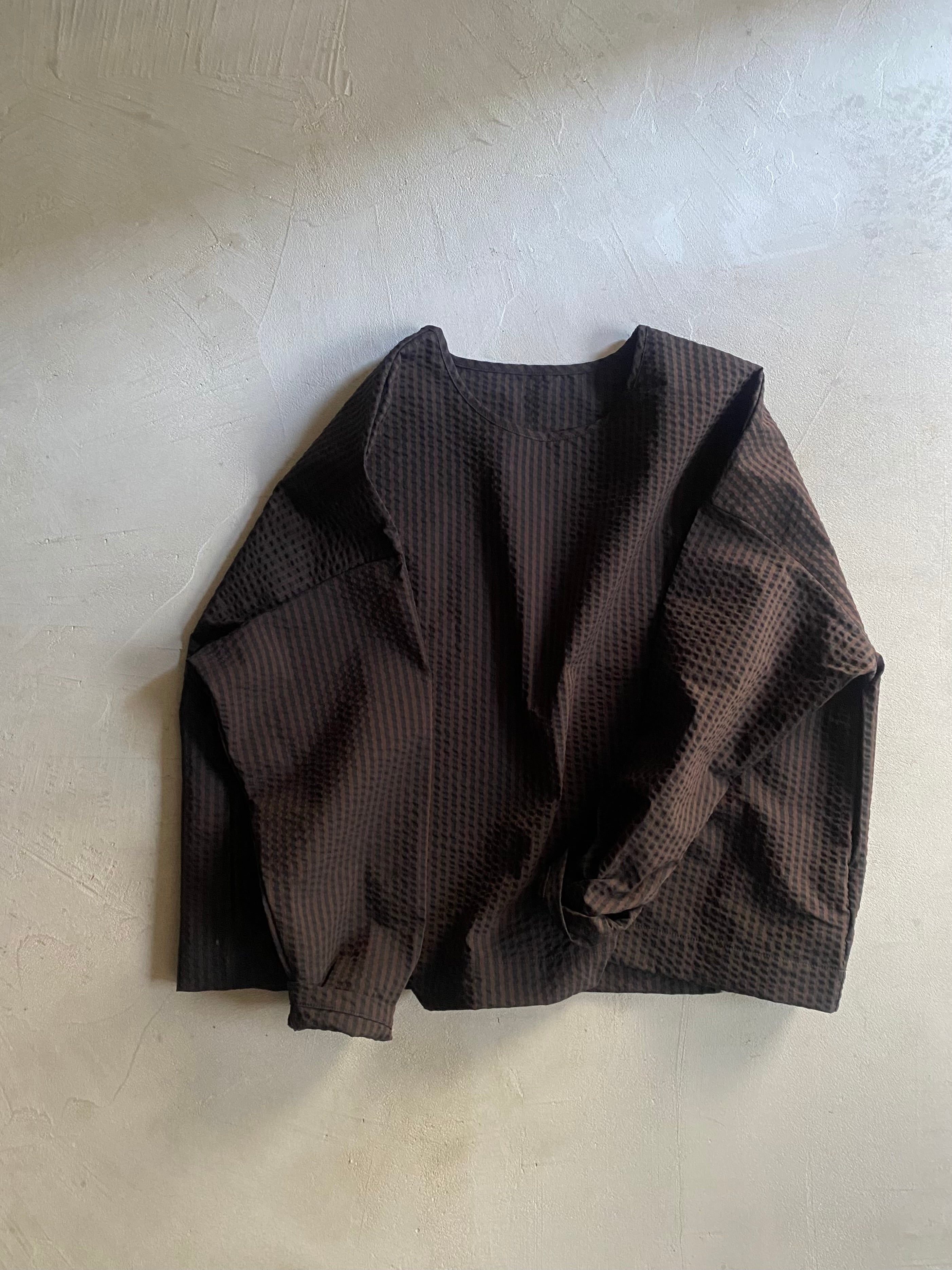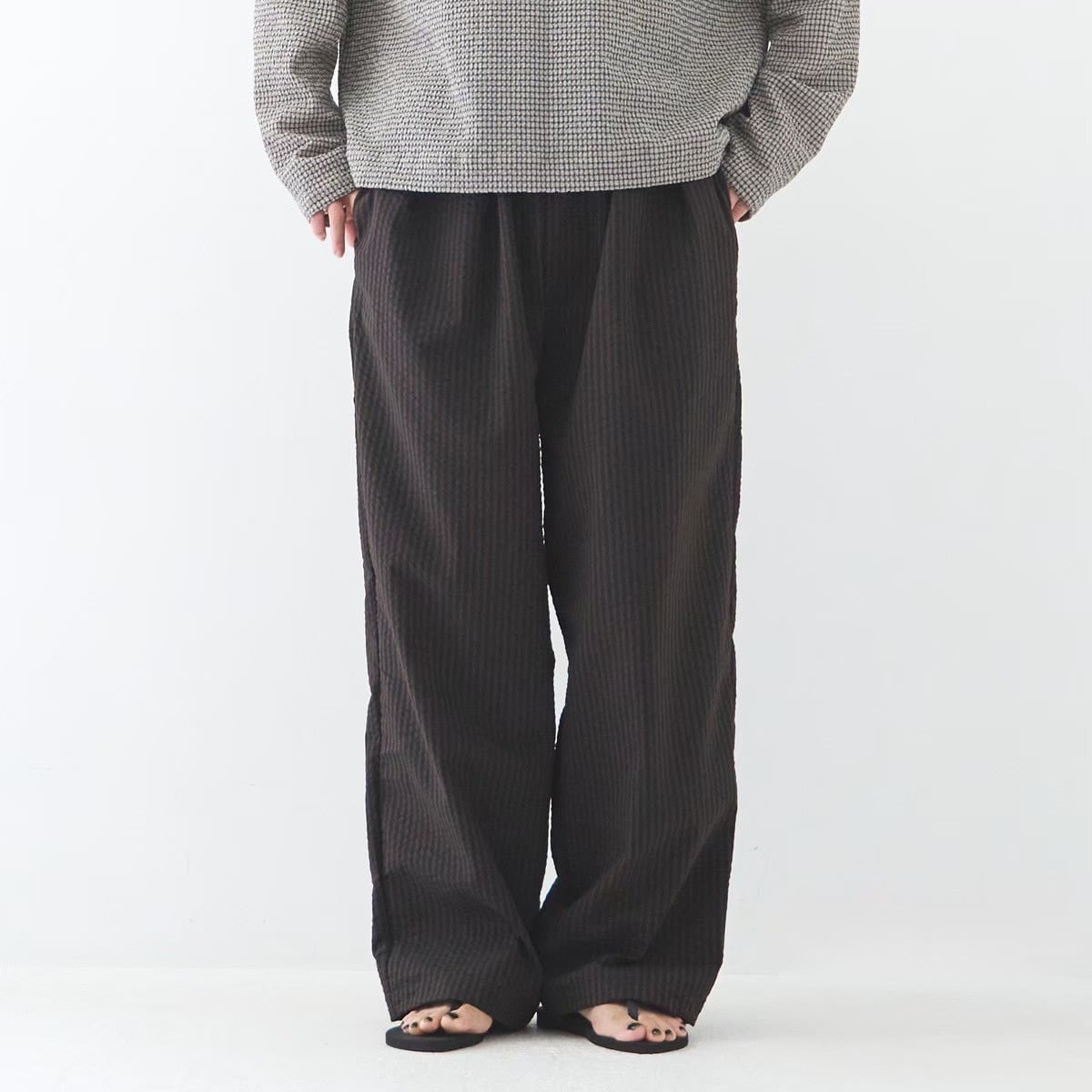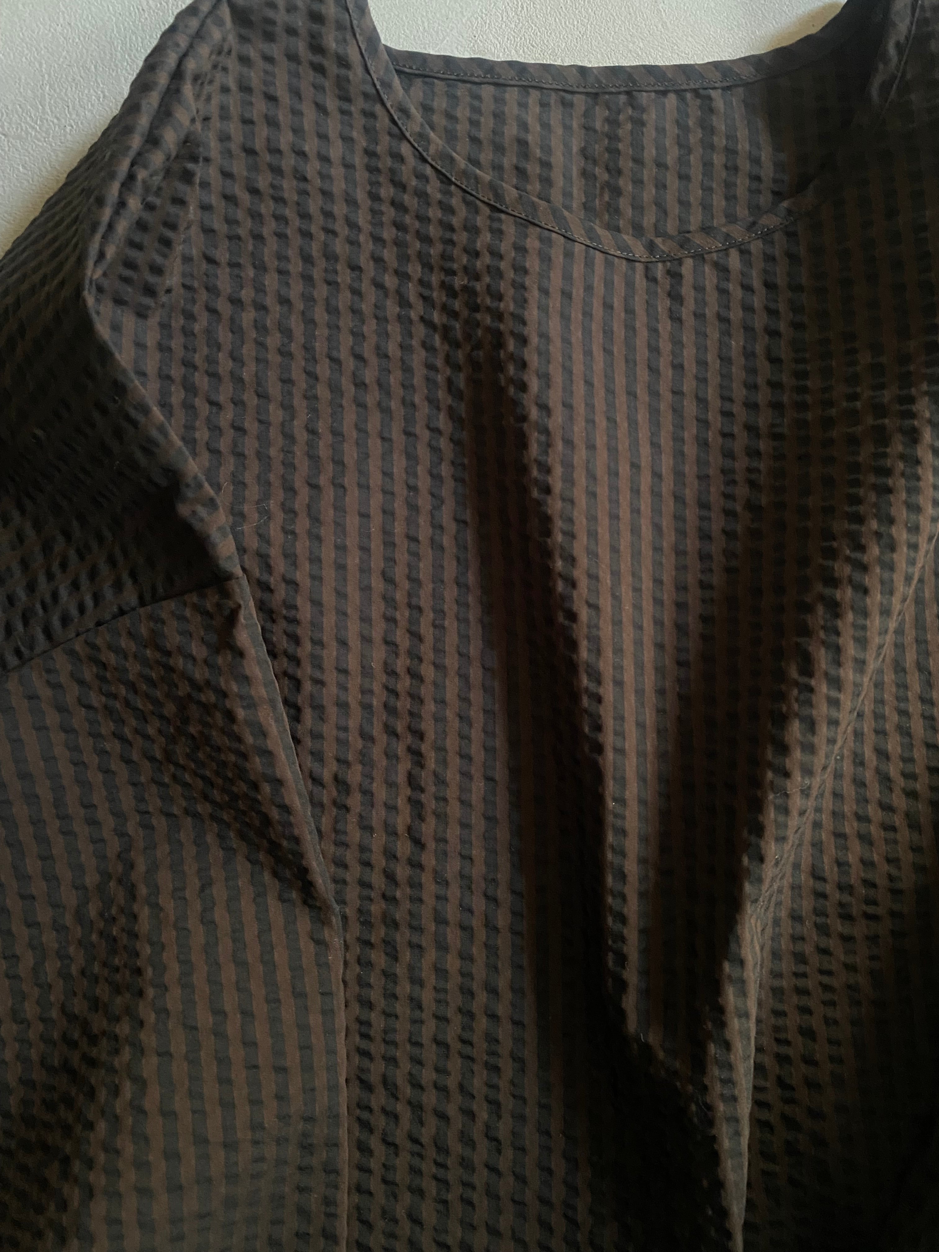 凸凹した縞状のシボが特徴のサッカー生地で仕上げました。ぽこぽことしたふくらみが空気を含み、柔らかく肌に添います。