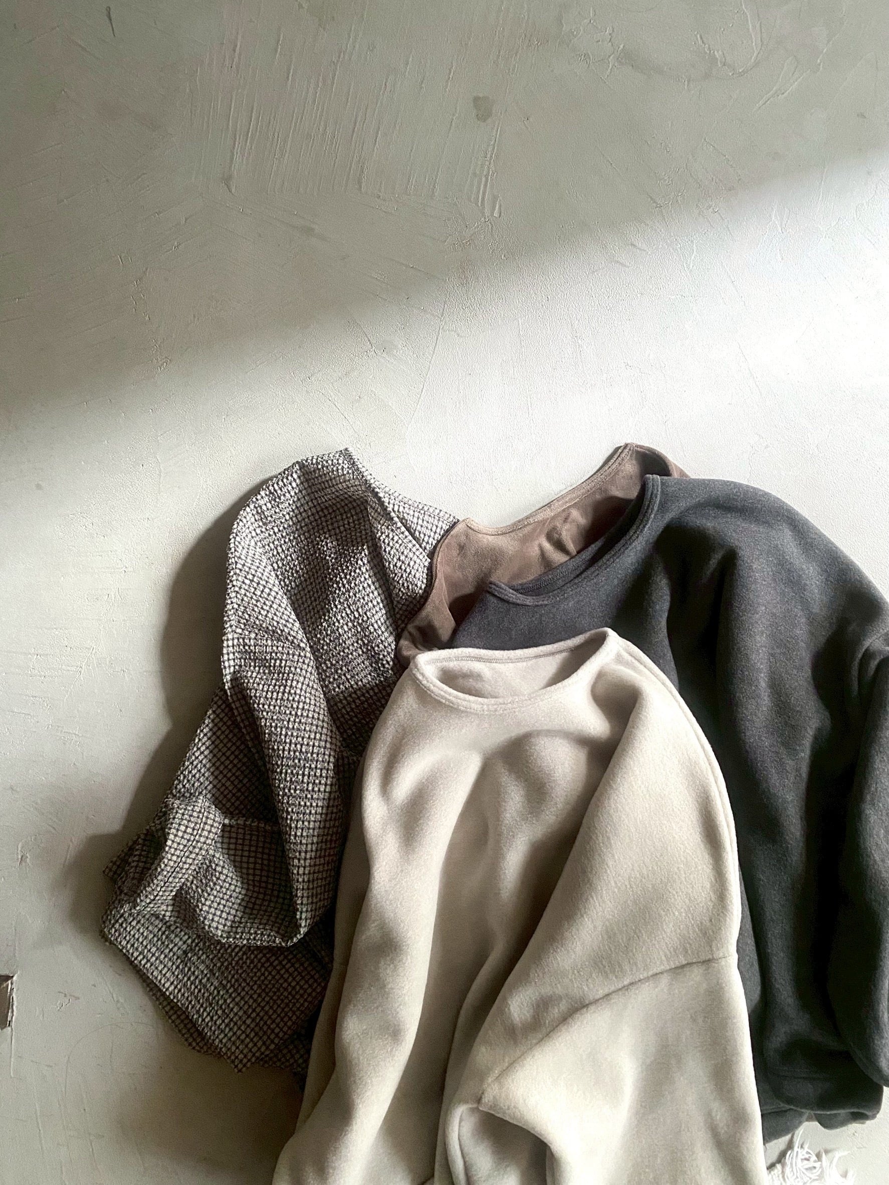 重ね着してもバランスがよいので、Check/Stripe pulloverと重ねて袖や裾から柄をのぞかせるのもおすすめです。