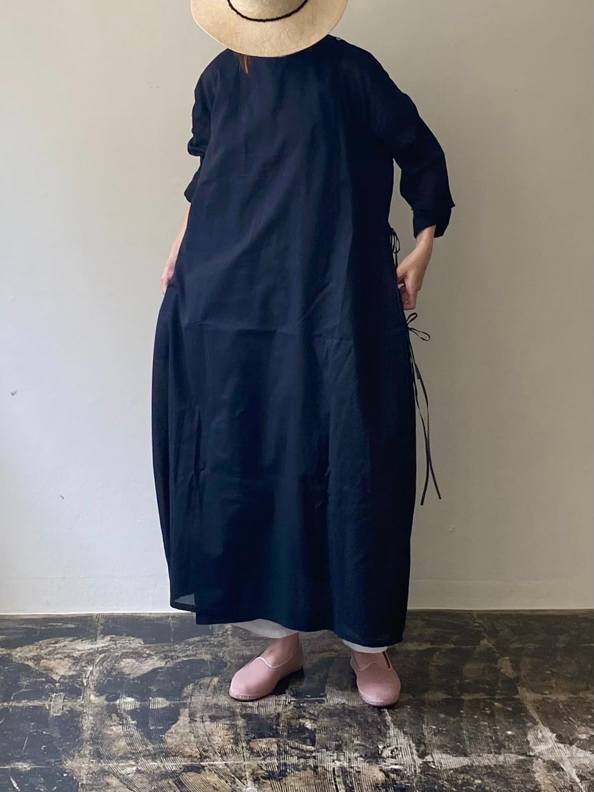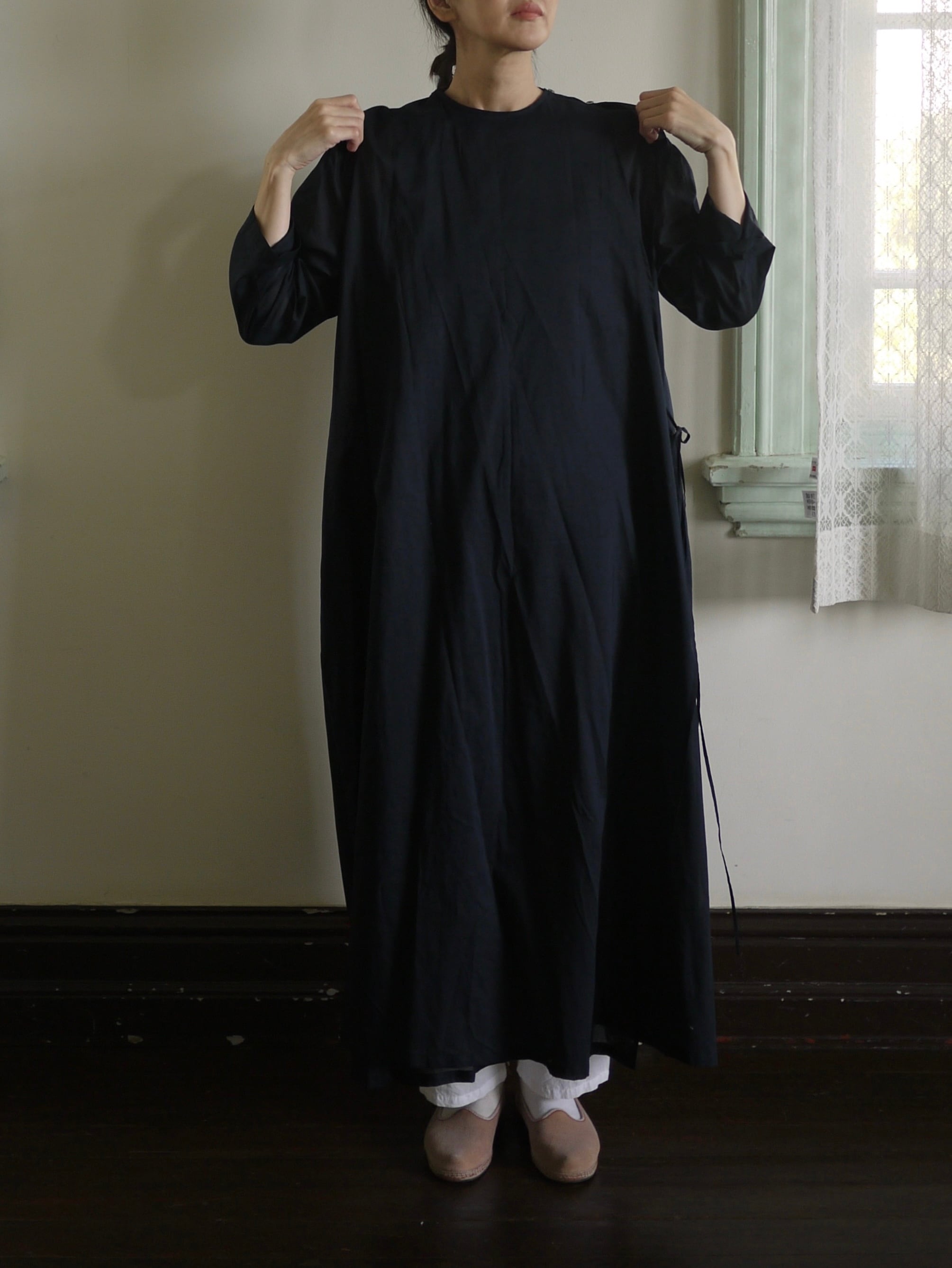 身幅や裾もたっぷりとあり、全体的にゆったりとしたシルエットのラップワンピースです。