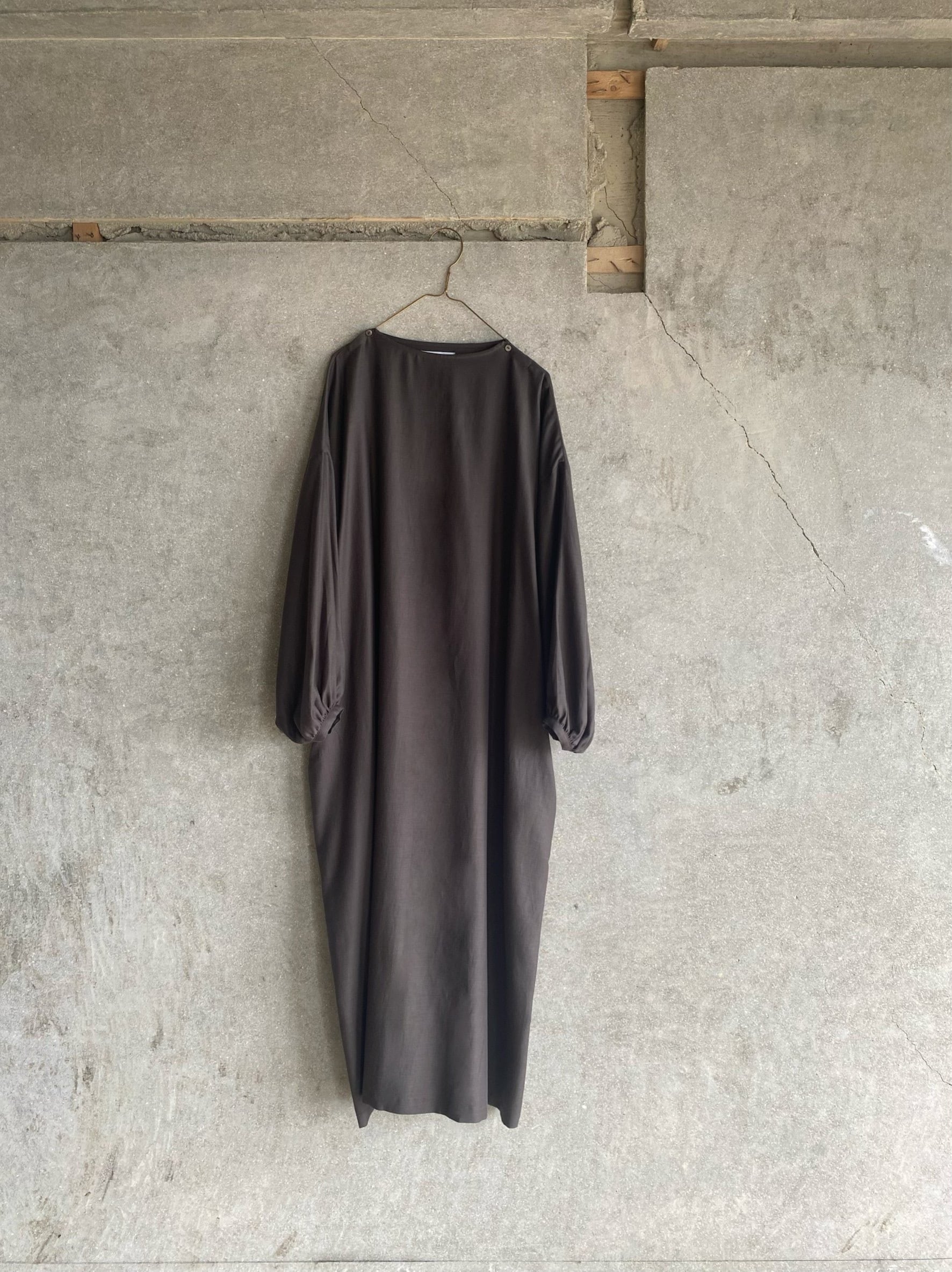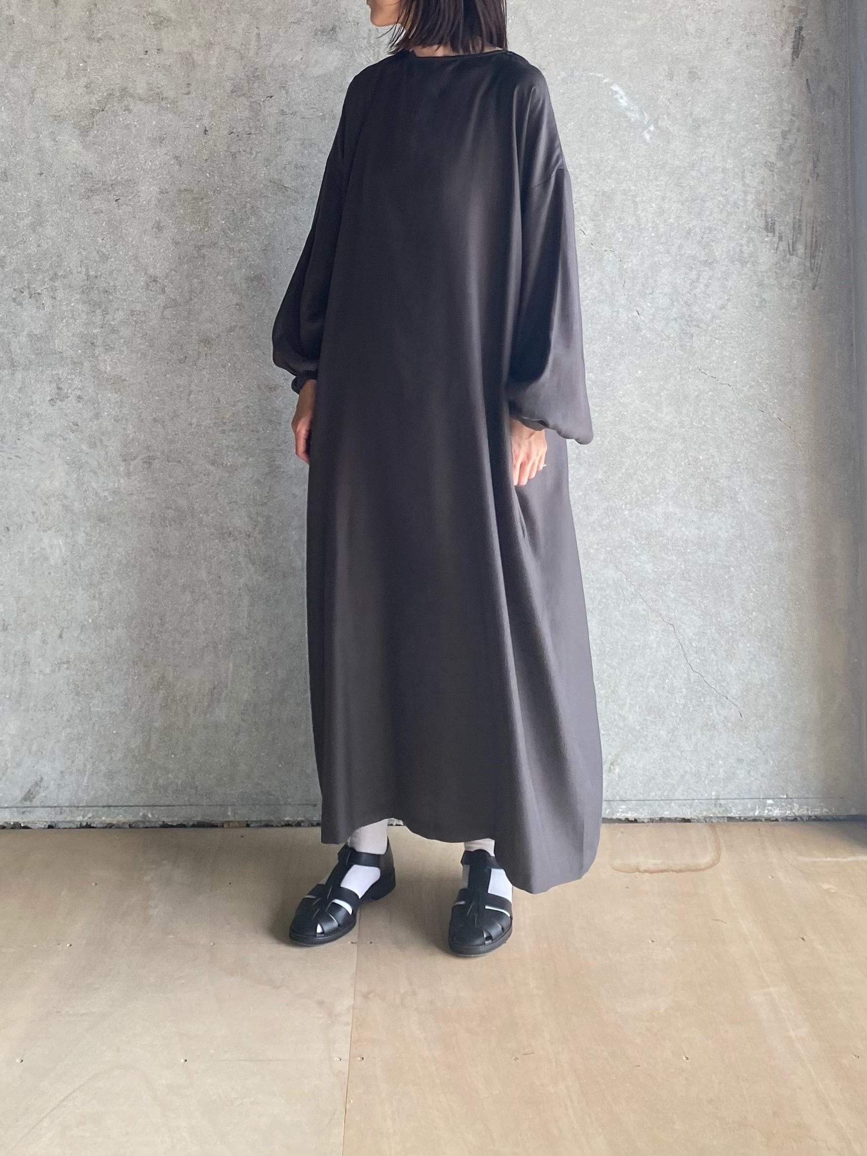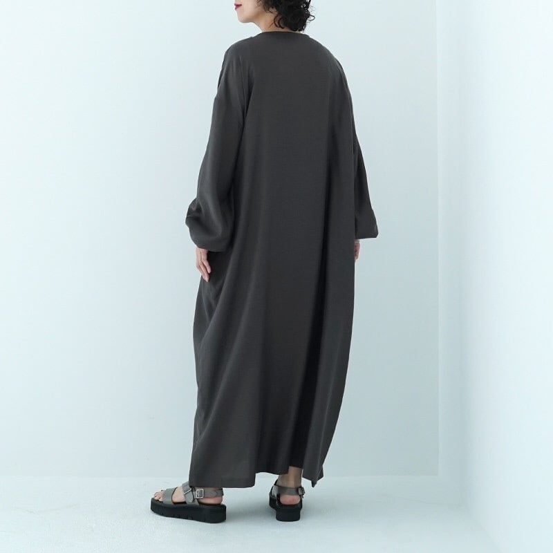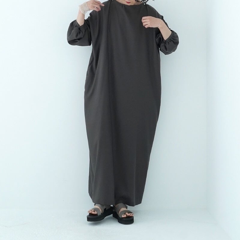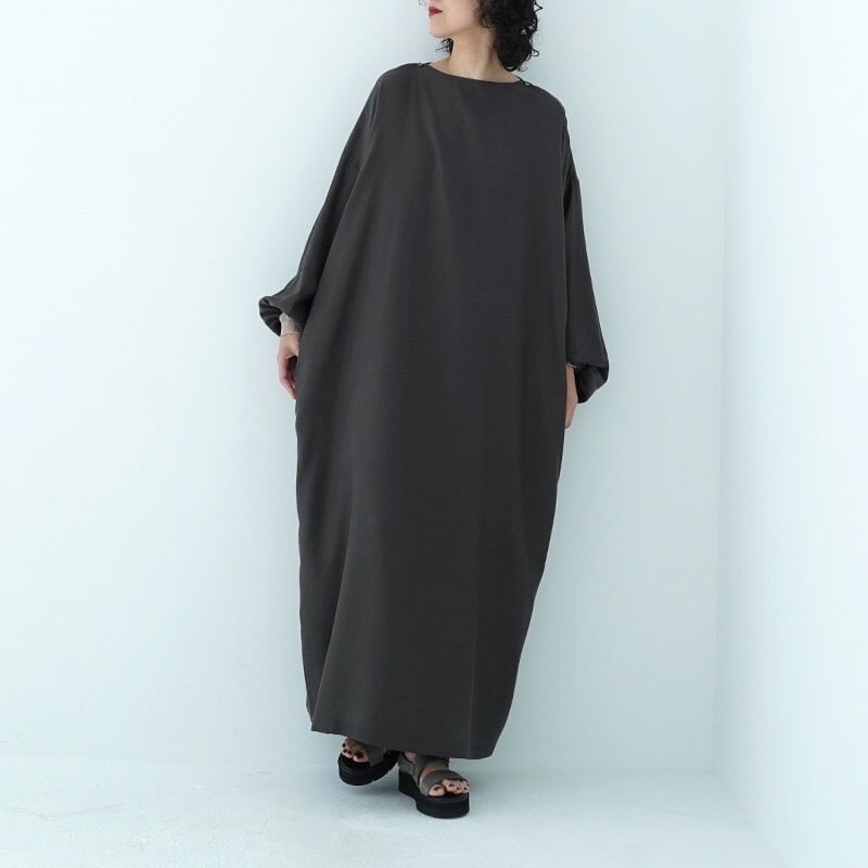 女性らしい柔らかなお袖とスッキリしたバトーネックに、キュプラコットンの優しい光沢やしなやかな風合いが、奥行きのあるシルエットのワンピースです。