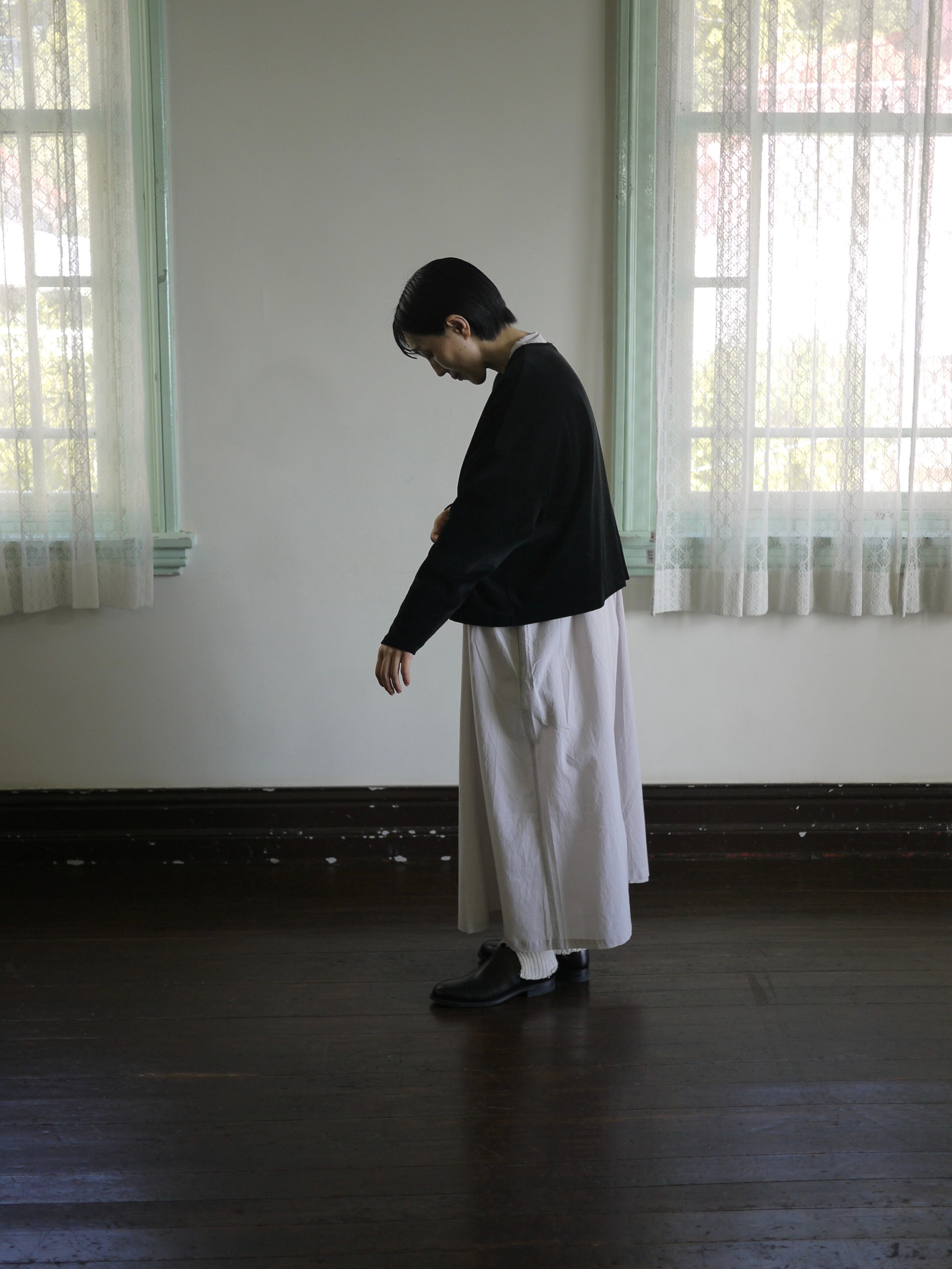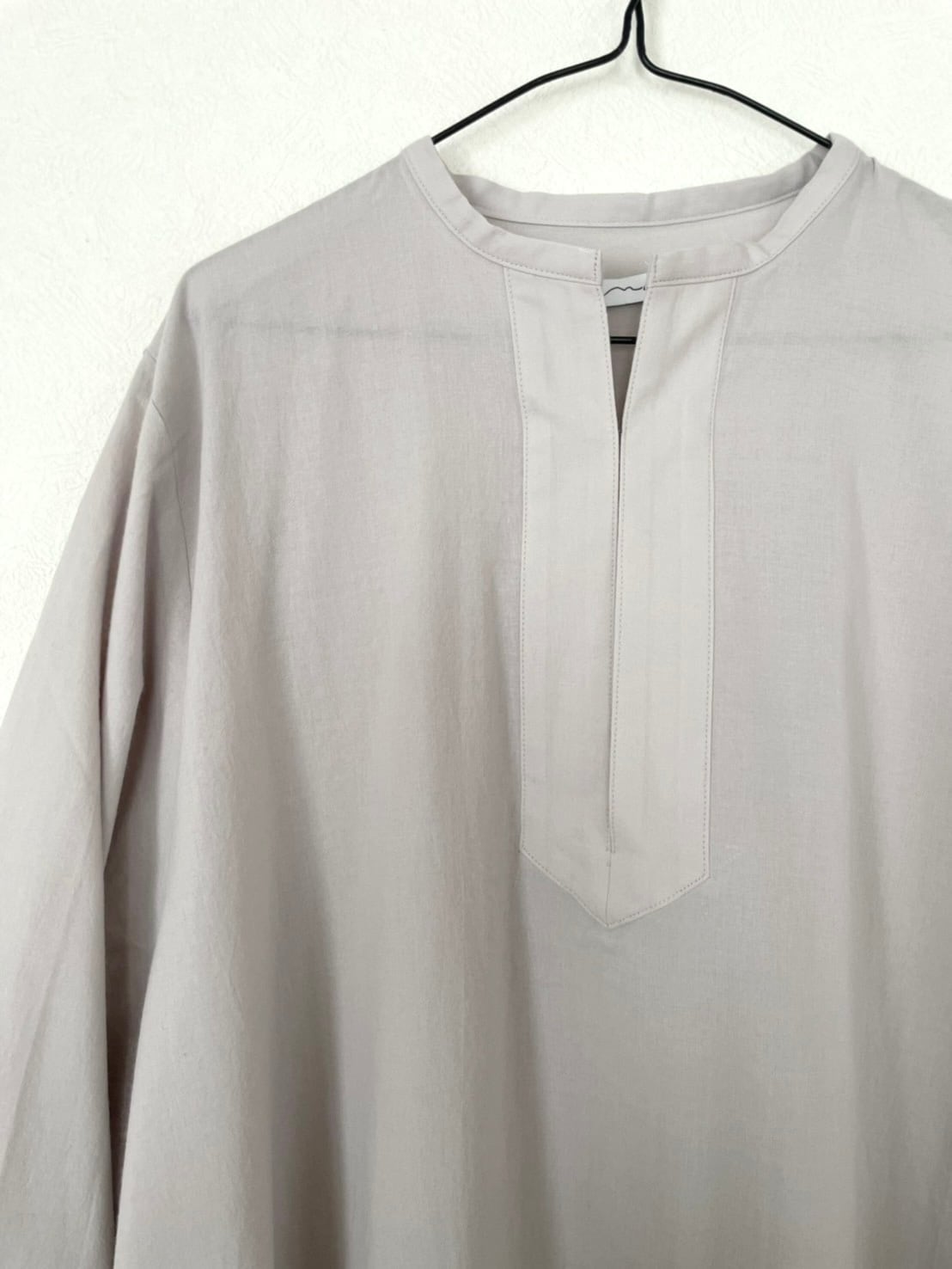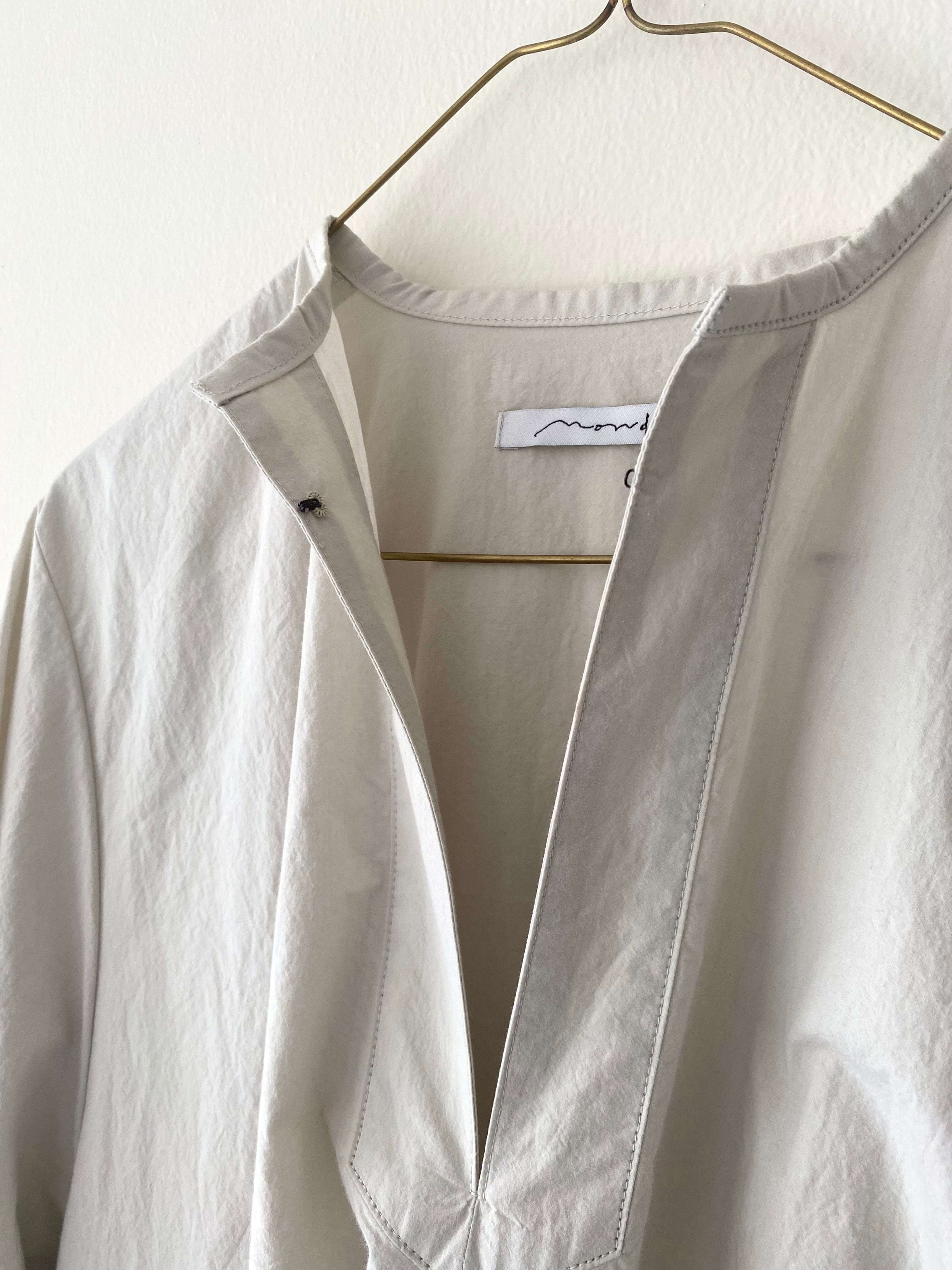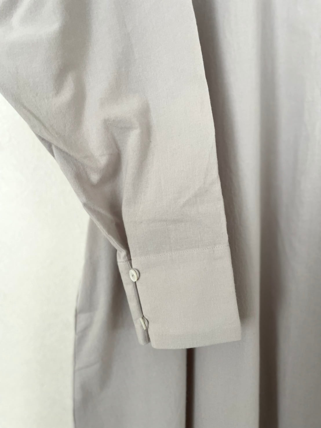 胸元はスプリングホックが付き、肩後ろに入れた太めのタックから裾に向かうシルエット、華奢なループボタンカフスなど、小さなこだわりがたくさん。